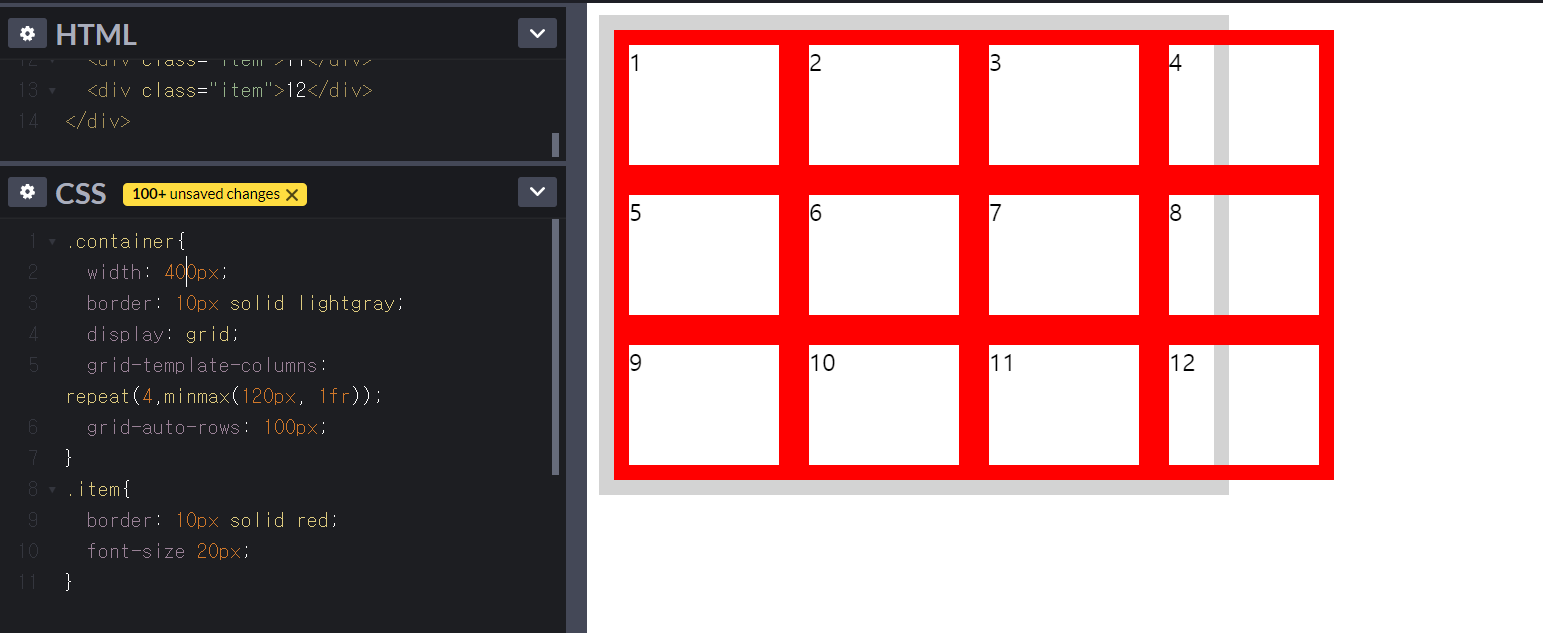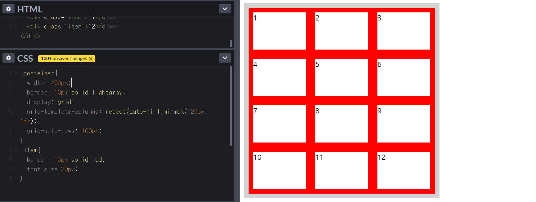 auto-fill, auto-fit  : 행/열의 개수를 그리드 컨테이너 및 행/열 크기에 맞게 자동으로(암시적으로) 조정